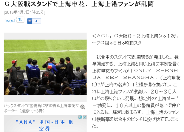 体坛娱乐 时间:2016-04-07 15:23来源:腾讯编辑:布丁不熬夜【导读】针对上海申花球迷在亚冠小组赛大阪主场与上港球迷大打出手事件,日本球迷普遍反响强烈。日迷吐槽申花闹剧,称从未听说过的搞笑段子。而此前两队球迷在澳洲墨尔本就发生过不愉快,看来是早就结下梁子。