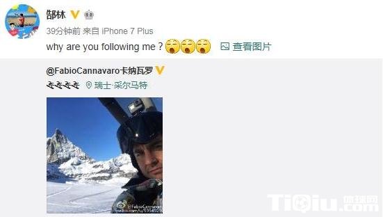 今天郜林和卡纳瓦罗就分别晒出了自己在同一地点的照片,郜林还调侃卡帅:“why are you following me?”