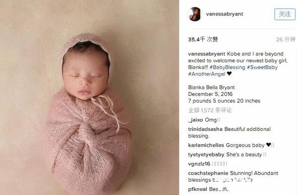 科比则写道:“瓦妮莎和我超级兴奋的迎来了我们的小宝贝的降生,bianka!!”
