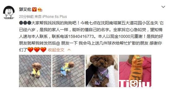 “大家帮我找找我的狗狗吧!今晚七点在沈阳南塔第五大道花园小区走失 它已经六岁,是我的家人一样,能听的懂自己的名字。全家找它心急如焚,望知情人速与本人联系,联系电话15940416773。”郭艾伦在微博上写道。从他分享的照片来看,这应该是一只小型的泰迪犬,长相憨态可掬,确实比较讨喜。