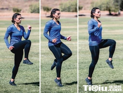 和正常的跑步相比,这项训练要把膝盖抬高,直到大腿与地面平行。跑步速度不能太快,身体不能向后倾斜。它还能增强髋部屈肌和股四头肌。