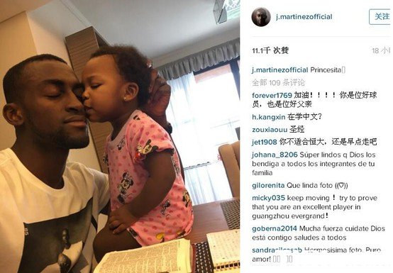 因伤休战的J马近日在社交网站晒出了一张和女儿的合影,并且配文说道:小公主。照片中,J马和女儿都闭起了眼睛,J马的女儿亲吻了了爸爸的脸颊,这一幕让人看起来倍感温馨。对于这样的一幕,有网友评价说道:“加油!!!!你是位好球员,也是位好父亲。”也有球迷说道:“加油,你一定要在广州恒大证明你是一位好球员!”不过,也有球迷发出不和谐的声音:“你不适合恒大,还是早点走吧!”