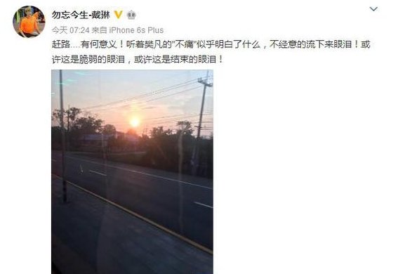 但是今天清晨的微博,却让人有点理不清头绪。“赶路....有何意义!听着樊凡的"不痛"似乎明白了什么,不经意的流下来眼泪!或许这是脆弱的眼泪,或许这是结束的眼泪!”