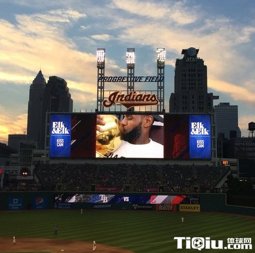 克利夫兰的MLB球队印第安人,大屏幕上放出了詹皇亲吻奖杯的照片,城市之光啊!