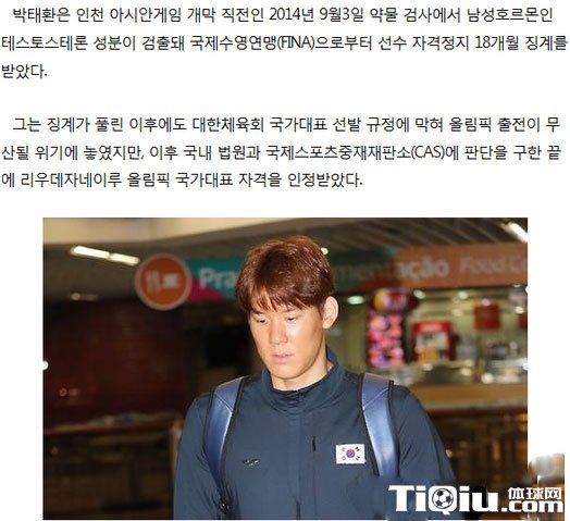 因为陷入禁药风波,朴泰桓被国际泳联禁赛18个月,而朴泰桓表示在医院接受过免费的脊椎矫正治疗,在治疗中可能被注射有违禁成分药物,但自己并不知道被注射了违禁药物。