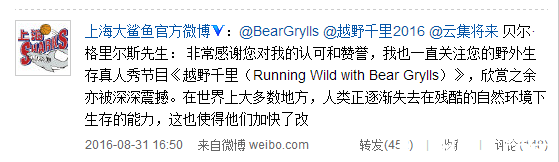 “贝尔·格里尔斯先生:非常感谢您对我的认可和赞誉,我也一直关注您的野外生存真人秀节目《越野千里(Running Wild with Bear Grylls)》,欣赏之余亦被深深震撼。在世界上大多数地方,人类正逐渐失去在残酷的自然环境下生存的能力,这也使得他们加快了改造大自然的步伐,其实在大自然的面前我们都很渺小,我们需要去找回这份本能,让我们的后代学会去与大自然、与动物融洽和谐地共存。我愿意接受您的挑战!——姚明”