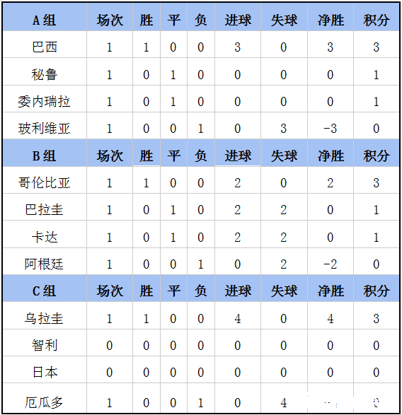 体坛娱乐 时间:2019-06-18 10:26来源:未知编辑:admin【导读】2019年美洲杯开踢,小组赛第一轮A组由地主巴西以3:0胜玻利维亚顺利拔得头筹,B组的阿根廷首战则以0:2输给了哥伦比亚,这也是阿根廷男足40年来首次在美洲杯首战输球、队史第3次,前2次他们在小组赛出局(1919和1979)。 目前各小组战绩如下: 美洲杯C组的焦点大战,非日本对智利莫属,双方在历史上有过两次交锋,十年前由日
