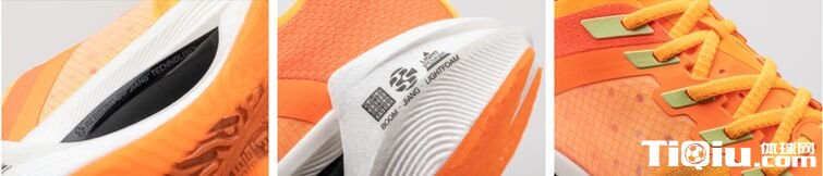 鞋面搭载Coolshell科技, 采用三段式设计将不同区域的功能区分: 前段采用半透明沙架贾卡材料,实现轻量透气;中段采用复合网布+Mono双层材料无缝工艺进行拼接,提供鞋面束紧;后段采用梭织网布,具有轻量耐磨损的特点,配合内侧泡棉从而更好提升后跟包裹性,整体外观轻盈通透,导热性能良好。