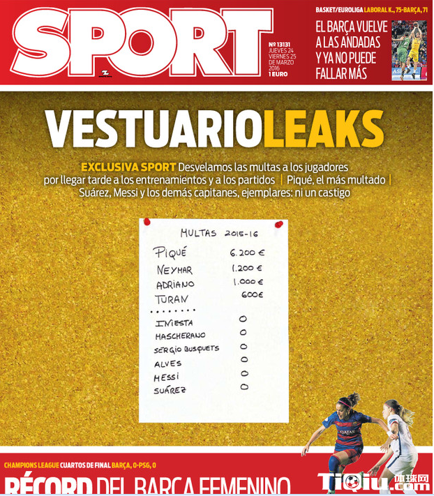 《每日体育报》今日头版独家披露了巴塞罗那更衣室内部罚款名单。据巴塞罗那俱乐部代表卡莱斯-纳瓦尔(Carles Naval)几星期前在参加一个加泰罗尼亚电台节目时曾经透露,恩里克为了保证更衣室纪律,对迟到的球员施行罚款制度,罚款的起点为200欧元。