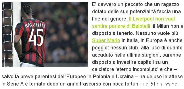 相关报道指出,1500万欧元的年薪对巴洛特利来说,是一个难以拒绝的数字。事实上,今冬就曾有传闻称某中超俱乐部有意引进巴神,但那时候他对入选意大利国家队踢欧洲杯还存在幻想,因此拒绝前往中超。如今,随着重回国家队的梦想濒临破灭,巴洛特利有望在夏季接受中超方面的报价。1500万欧元的年薪足以使他和河北华夏幸福外援拉维奇一样,成为中超的“打工皇帝”。