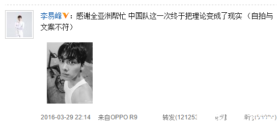 北京时间3月29日晚20:15,2018年世界杯亚洲区预选赛小组赛最后一轮全面打响,国足在西安2-0击败卡塔尔,积分来到11分排名小组第二,由于菲律宾主场3-2阻击朝鲜,澳大利亚主场5-1击败了约旦,伊朗2-0击败阿曼,国足也以成绩最好的4个小组第二之一打入了12强赛。国足本场比赛成为今晚无数国人最关注的事情,着名演员、歌手李易峰也在微博上表示:“感谢全亚洲帮忙 中国队这一次终于把理论变成了现实”,还晒出一张健身照并且注明:自拍与文案不符。 国足想要晋级世预赛亚洲区12强赛,就必须在今晚的比赛拿下卡塔尔,幸好黄博文、武磊的两粒进球让国足完成目标。着名演员、歌手李易峰也发微博为国足叫好:“感谢全亚洲帮忙 中国队这一次终于把理论变成了现实”,而他的健身照也引发一阵热评,甚至有粉丝调侃:足球把你炸出来了、感谢全亚洲帮忙让你发了自拍。