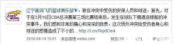 北京时间4月14日,辽宁男篮在其官方微博上发表道歉信,就3月16日CBA总决赛第三场比赛结束后,球队在下榻酒店楼前的冲突事件做出回应。辽篮在道歉信中对在此次冲突中受到伤害的人说声抱歉,并希望给予参与到冲突事件中几名球员一次改过的机会。