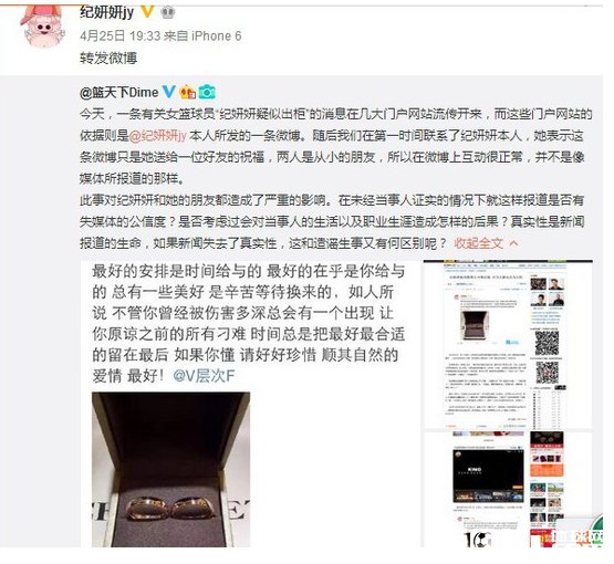 不过正当外界热炒纪妍妍公布恋情的事情时,微博号为“篮天下Dime”的媒体发微博表示,在经过了与纪妍妍的沟通联系之后,纪妍妍表示这则微博只是她送给好友的一段祝福,两人是很好的朋友,这只是在微博上正常的互动,并不像外界所猜测的那样。