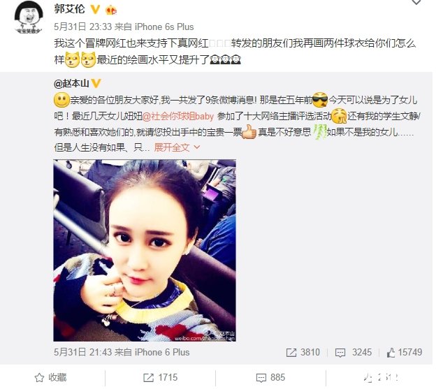 郭艾伦微博为赵本山女儿拉票 号称假网红支持真网红