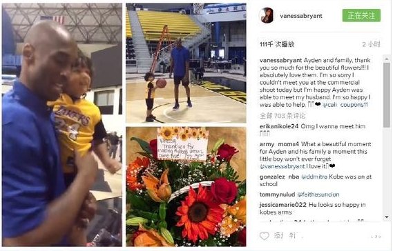 就在今天,瓦妮莎兑现了自己的承诺,在个人社交网站上晒出了Ayden与科比见面的视频。她安排了Ayden一家探班正在拍广告的科比,Ayden非常激动能够与科比一起打球。之后,Ayden的母亲送了一盆花给瓦妮莎表示感谢。