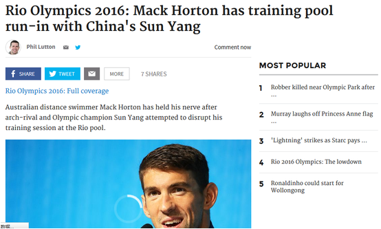 澳媒称孙杨干扰本国选手训练 新闻标题满是挑衅