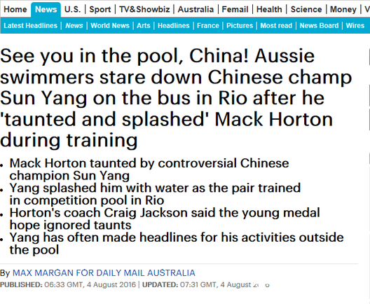 每日邮报澳洲版也对该事件进行报道,标题为“中国!我们泳池见。”充满挑衅意味。文章透露孙杨曾在训练中试图干扰霍顿,之后他和另两位澳大利亚泳将史密斯、帕尔默乘同一辆车返回奥运村,被拍到有过一段深谈。照片中孙杨面带笑容,但两位澳洲人的表情并不太友好。