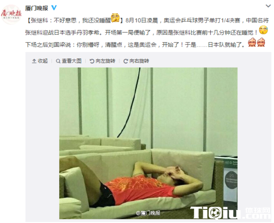 丢掉首局因没睡醒 网曝张继科赛前十分钟还在睡