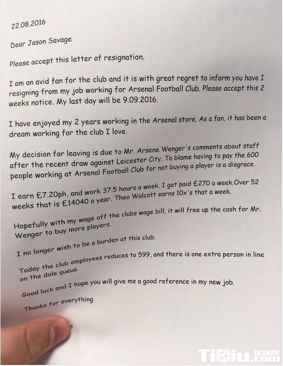 据英国《太阳报》爆料,一位自称是阿森纳俱乐部工作人员的人士昨日晒出辞职信,疑似对温格不花钱的抗议。