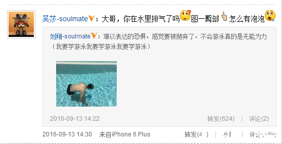吴莎很快转发了刘翔的微博,她搞笑的写道:“大哥,你在水里排气了吗[疑问]图一臀部怎么有泡泡[吃惊]”