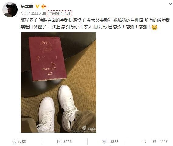 “旅程多了 护照页面的字都快蹭没了 今天又要启程 继续我的生涯路 所有的经历都装进口袋里了 一路上 感谢有你们 家人 朋友 球迷 感谢!感谢!感谢!”
