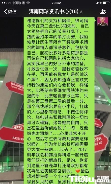彭帅之所以如此愤怒,是因为有人将她在球迷微信群里的言论截图发在了网上。在被曝光的这段话中虽有些不理性的语言,但彭帅还是认为张帅的行为可以理解。