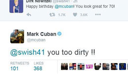 球员与老板之间,最和谐的关系莫过于亲如一家人。诺维茨基与库班,便是联盟里的典范。在自己的推特上,诺维茨基便恶搞了自己的老板,并得到了库班的回应,可谓基情四射。...